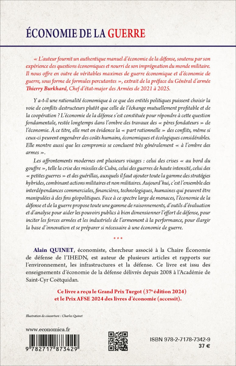 L’auteur fournit un authentique manuel d’économie de la défense, soutenu par son expérience des questions économiques et nourri de son imprégnation du monde militaire. Il nous offre en outre de véritables maximes de guerre économique et d’économie de guerre, sous forme de formules percutantes », extrait de la préface du Général d’armée Thierry Burkhard, Chef d’état-major des Armées de 2021 à 2025.
