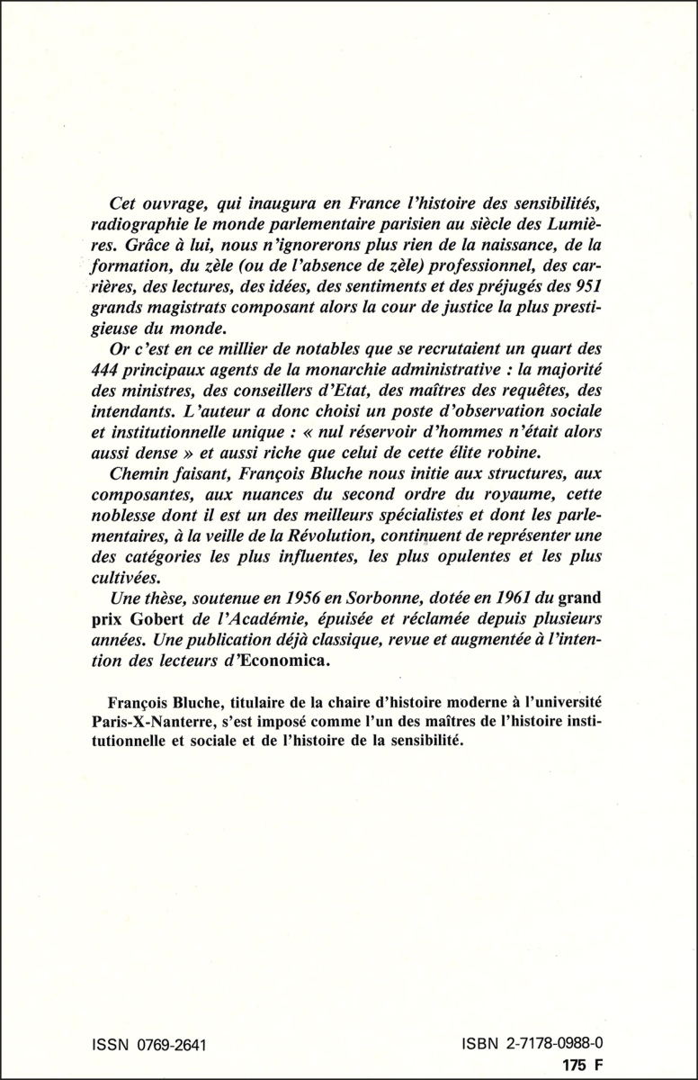 Au siècle des Lumières, cet ouvrage propose une véritable radiographie du monde parlementaire parisien. Il analyse la naissance, la formation, les carrières et les mentalités de la noblesse de robe qui compose cette haute cour de justice.