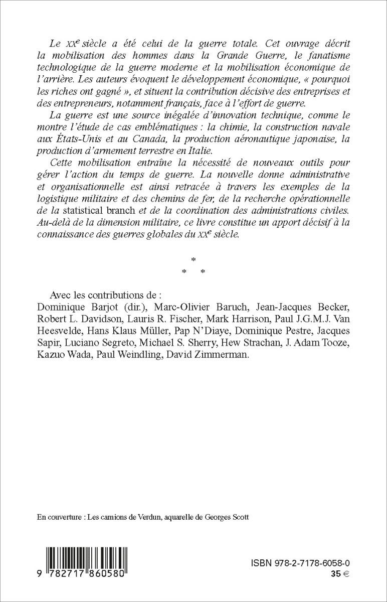 Le XXe siècle a été celui de la guerre totale. Cet ouvrage décrit la mobilisation des hommes dans la Grande Guerre, le fanatisme technologique de la guerre moderne et la mobilisation économique de l'arrière. Les auteurs évoquent le développement économique, « pourquoi les riches ont gagné », et situent la contribution décisive des entreprises et des entrepreneurs, notamment français, face à l'effort de guerre.