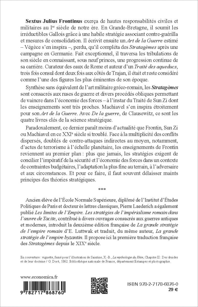 Ancien élève de l'École Normale Supérieure, diplômé de l'Institut d'Études Politiques de Paris et docteur ès lettres classiques, Pierre Laederich a également publié Les limites de l'Empire. Les stratégies de l'impérialisme romain dans l'œuvre de Tacite, contribué à divers ouvrages consacrés aux guerres antiques et modernes, introduit la deuxième édition française de La grande stratégie de l'empire romain d'E. Luttwak et traduit, du même auteur, La grande stratégie de l'empire byzantin. Il propose ici la première traduction française des Stratagèmes depuis le XIXe siècle.