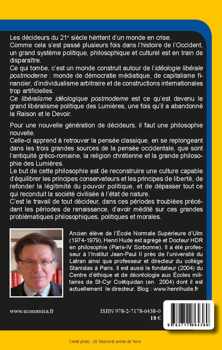 Pour une nouvelle génération de décideurs, il faut une philosophie nouvelle.Celle-ci apprend à retrouver la pensée classique, en se replongeant dans les trois grandes sources de la pensée occidentale, que sont l'antiquité gréco-romaine, la religion chrétienne et la grande philosophie des Lumières.Le but de cette philosophie est de reconstruire une culture capable d'équilibrer les principes conservateurs et les principes de liberté, de refonder la légitimité du pouvoir politique, et de dépasser tout ce qui reconduit la société civilisée à l'état de nature.C'est le travail de tout décideur, dans ces périodes troublées précédant les périodes de renaissance, d'avoir médité sur ces grandes problématiques philosophiques, politiques et morales.